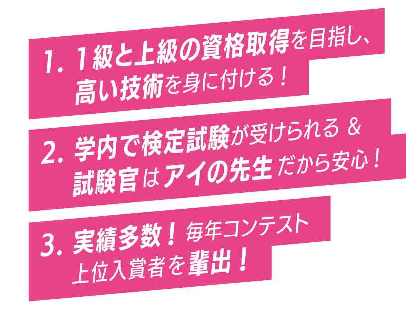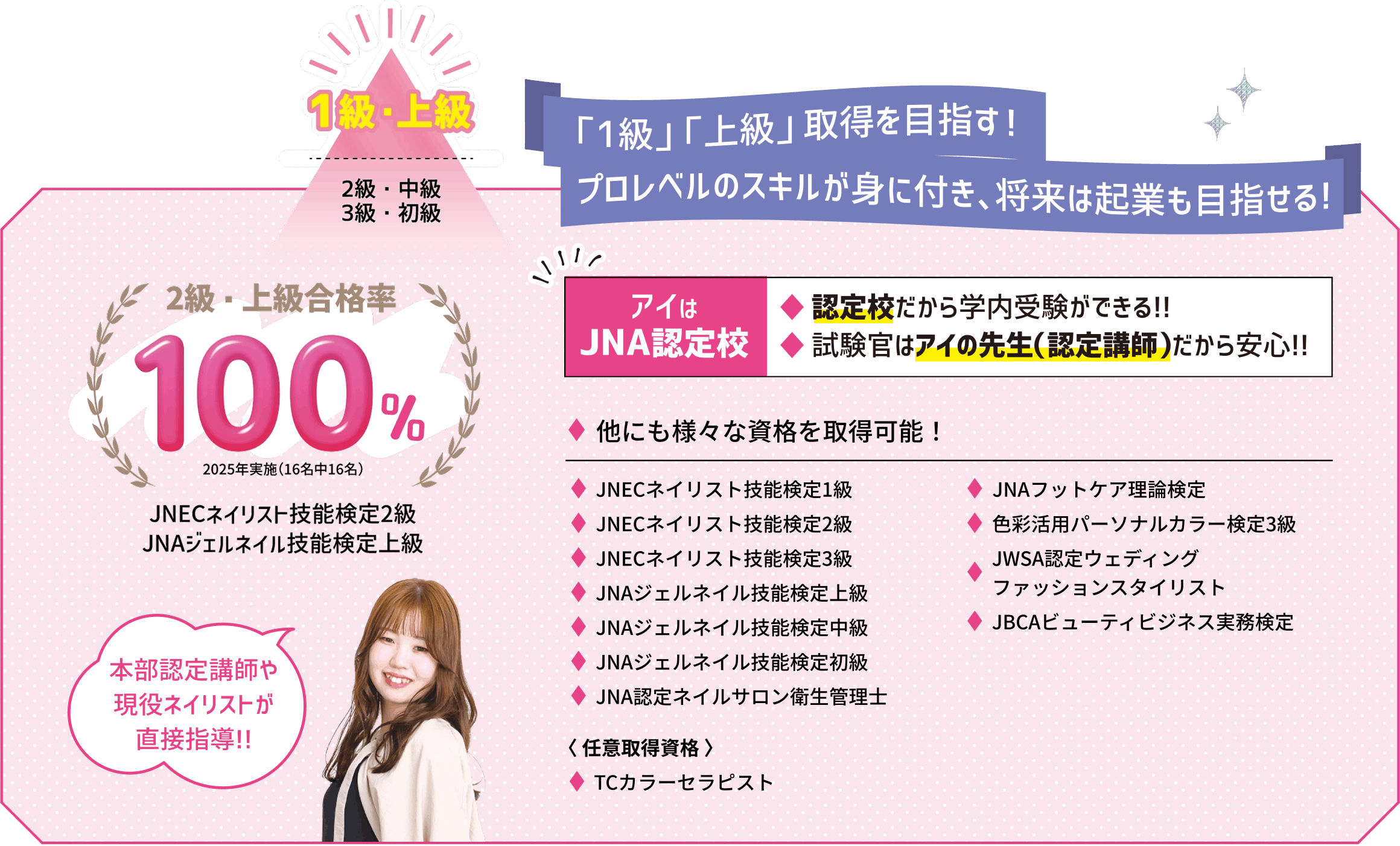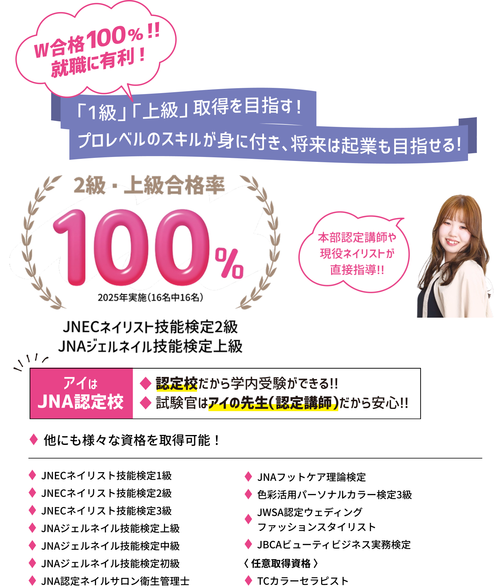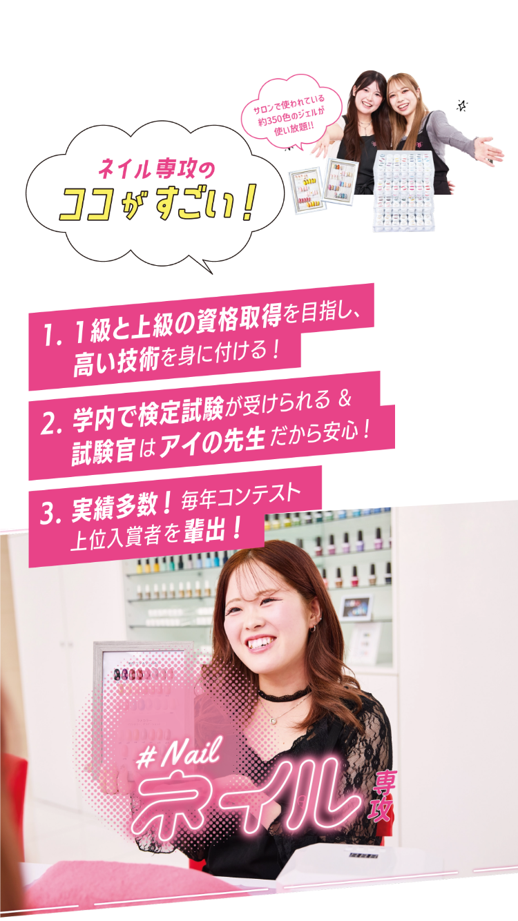 ネイリストを目指して、今はネイル検定の取得に向けて頑張っています。先生方が一人ひとりの技術や苦手なところを丁寧に見てくださり、細かくアドバイスをもらえるので、上達していく実感がありとても嬉しいです。何より友達と話す時間が楽しく、毎日が充実しています!