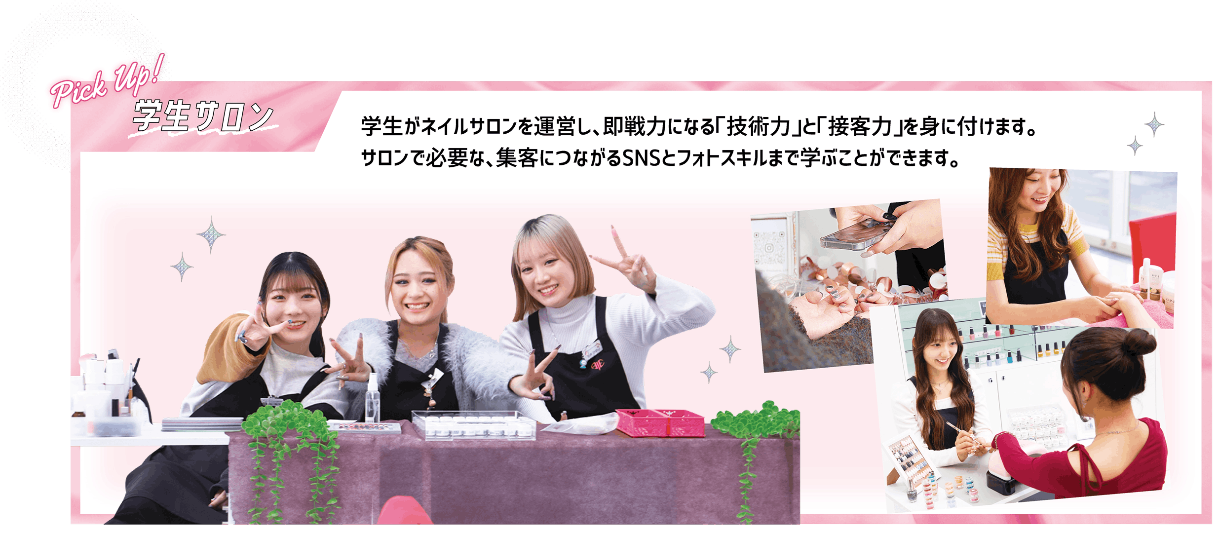カラーを塗る技術や、ストーンやラメをつけたり、柄やイラストを描く技術まで身に付けます。