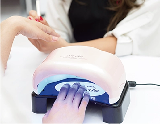爪に塗ったジェルにライトを照射して、硬化させながら仕上げていく技術を学びます。
