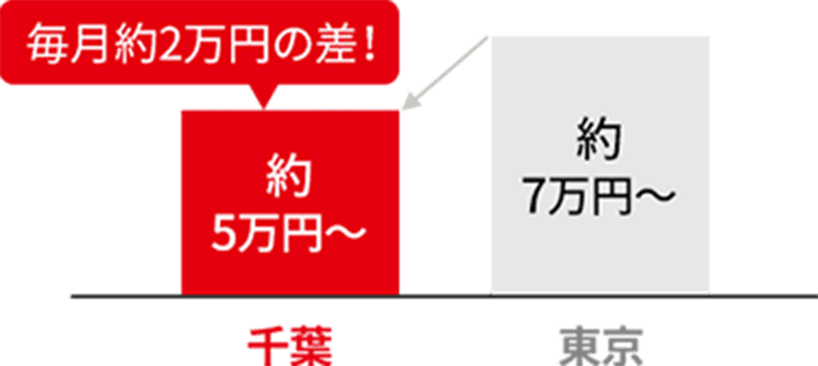 都内であれば、治安や建物の築年数、設備などを踏まえると平均家賃は7万円以上はするでしょう。一方で千葉であれば1R・1Kの家賃相場は平均5万円~5万5千円です。